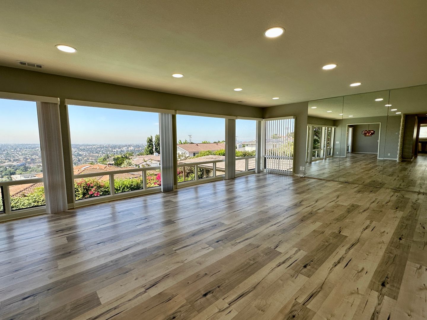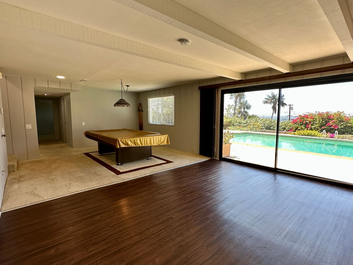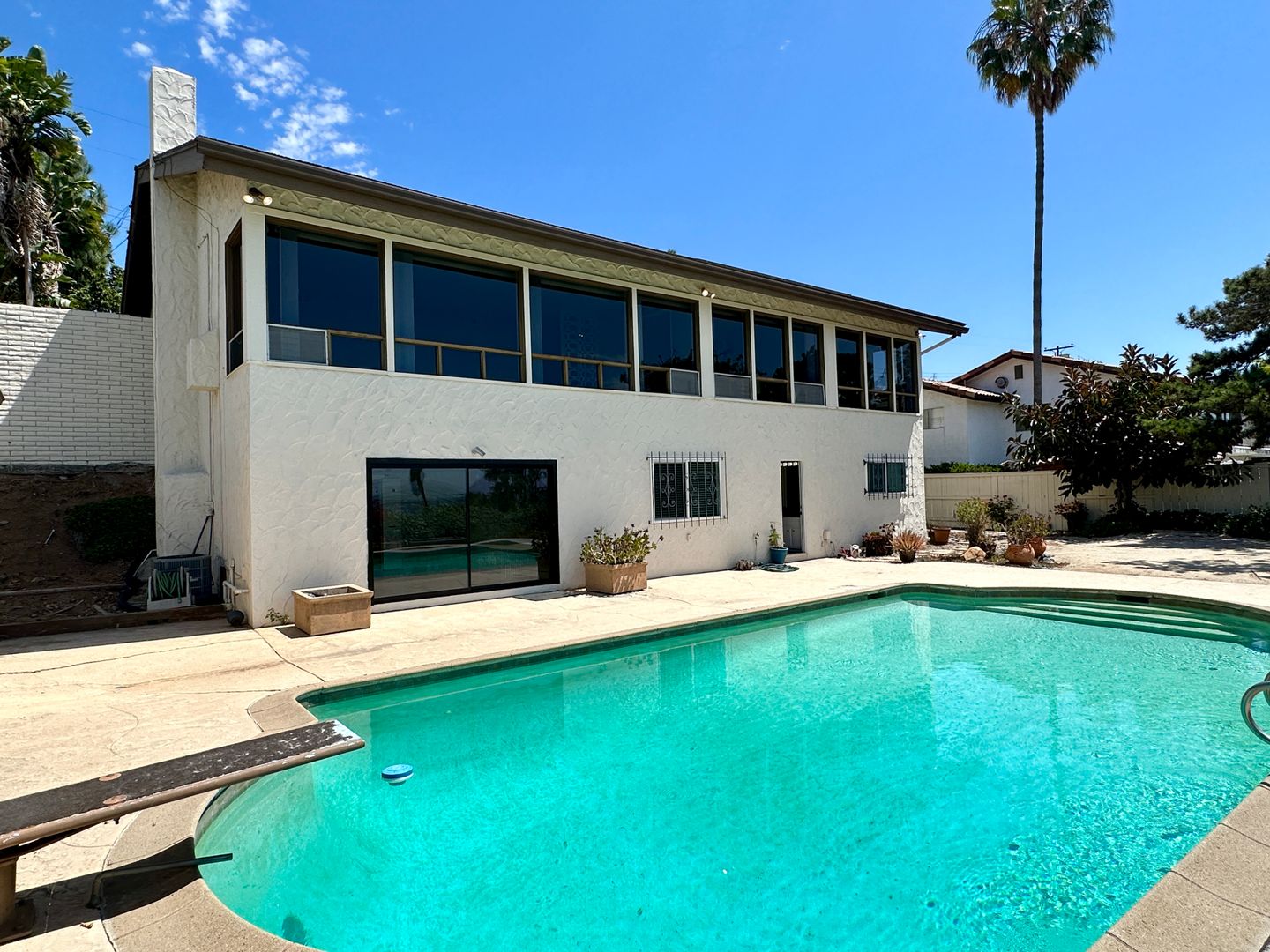 This beautiful, two story, 3 bedroom 2.5 bathroom hilltop house in Del Cerro is 3486 sqft and has amazing views as far as the ocean. The entry opens into a foyer with a beautiful mid-century wood decor. The foyer opens into the west facing living room with stunning views from floor to ceiling. The kitchen, dining and living room all share these breathtaking views. Kitchen features upgraded appliances and has a breakfast nook, separate from the formal dining area. Master bedroom features an ensuite bathroom with two sinks, a sliding glass door to a private patio and plenty of closet space. Downstairs features two additional bedrooms, one bathroom and an entertainment room with a pool table, wet bar and a decorative fireplace. Some of the other amenities include pool with diving board, outdoor sauna, central a/c, 3 car garage with an additional refrigerator for those Costco runs, laminate flooring on main level, recessed LED lighting and an extremely large pantry. Property is located close to the 8 freeway.